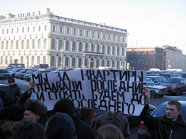 Главный питерский национал большевик Андрей Дмитриев подогревал толпу, скандируя "Долой такую власть!", а завершился митинг и вовсе лозунгом "Россия без Путина, Питер без Матвиенко!". Что и говорить, к теме жилищно-коммунальной политики и факторов, ее определяющих, собравшиеся подошли серьезно.