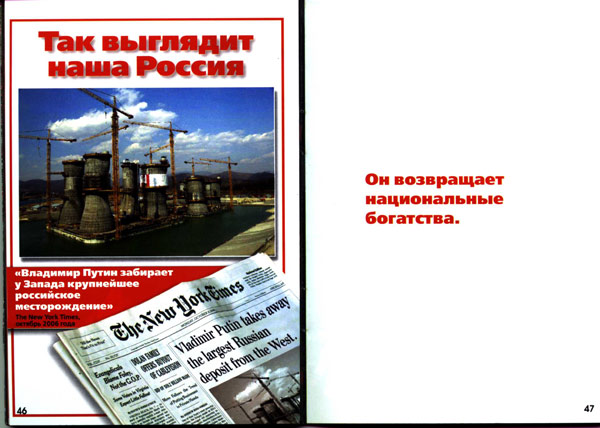 Несколько следующих страниц готовят нас к апофеозу действа – цитируются заголовки иностранных газет про мировое лидерство России и "возвращении национальных богатств". Какая польза российскому населению, задавленному монетизациями, реформами ЖКХ, "национальными проектами" и "газом по европейским ценам" от коммерческих успехов кремлевской корпоративной клептократии – этот вопрос, я надеюсь, будет подробно освящен в следующее брошюре. А то ведь интересно же, действительно.