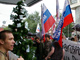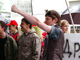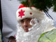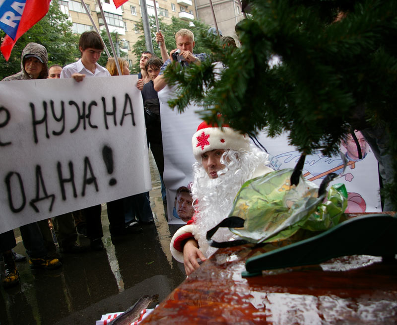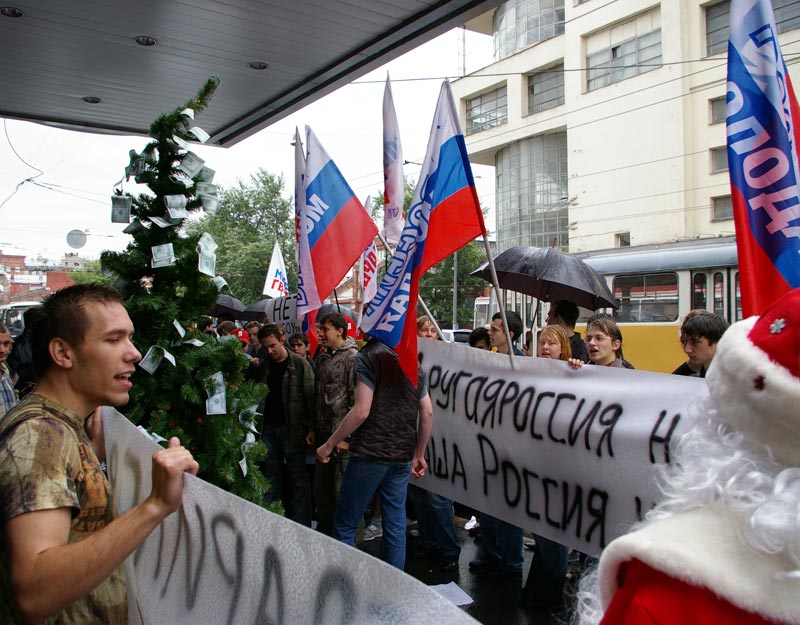 Между тем перед собравшимися девушка из "Молодой Гвардии" начала читать стихи. По ее словам, Каспаров ввергнет Россию в хаос революции. Кроме того, еще один активист, переодевшись в деда мороза, достал из мешка курицу и сушеную рыбу. Затем он завернул это все в американский флаг.