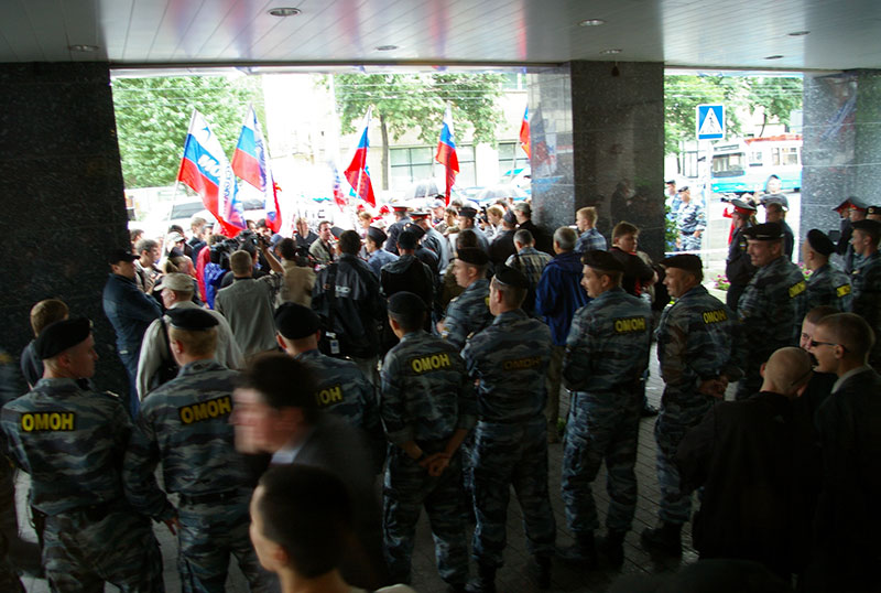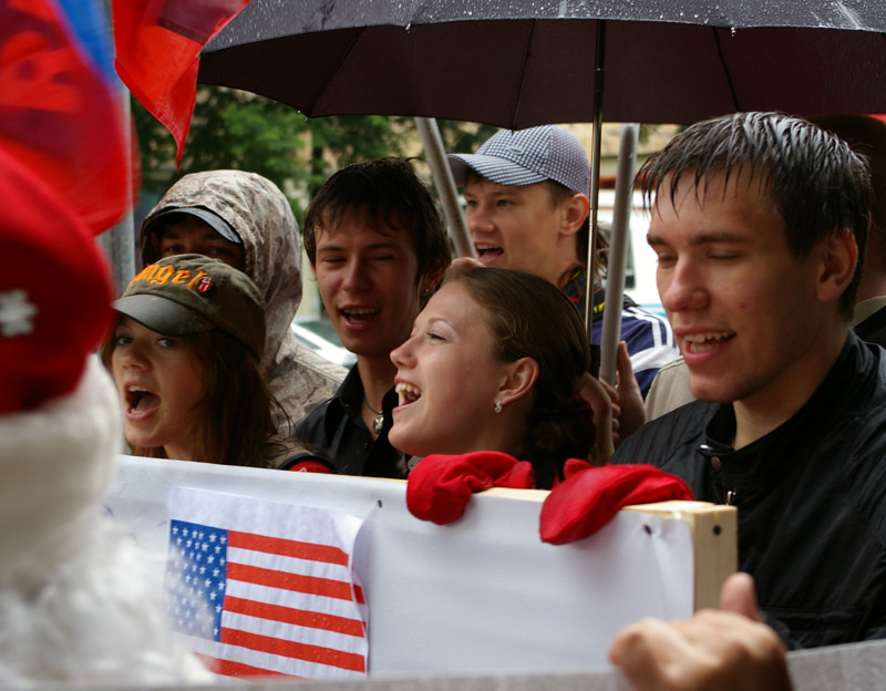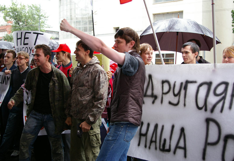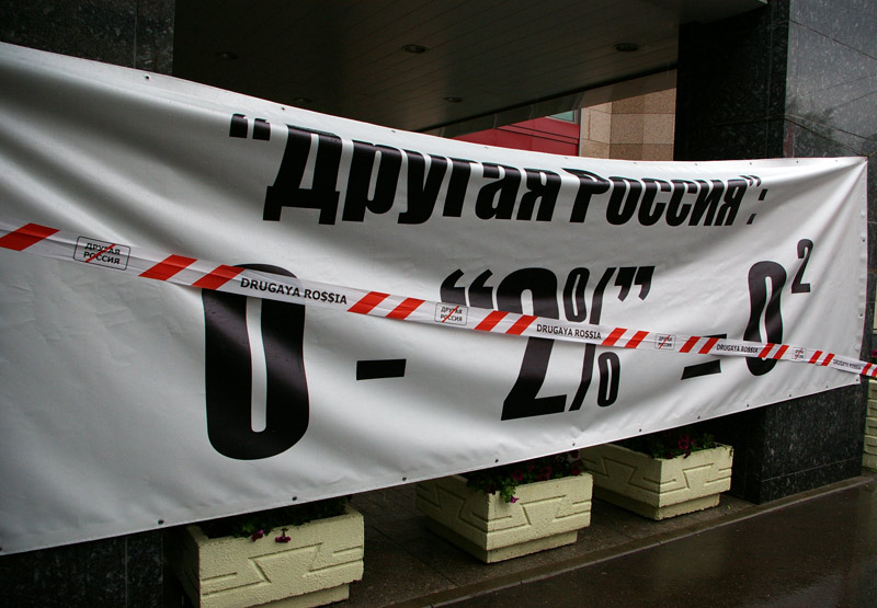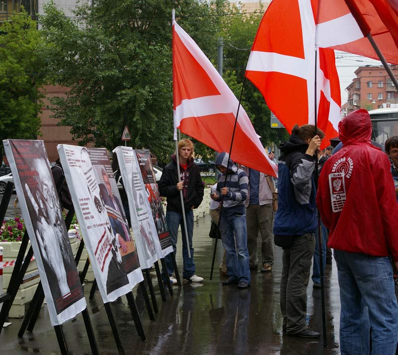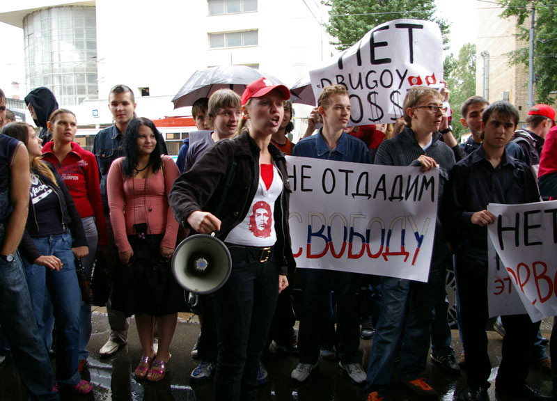 В акции приняли участие около 10 человек из "Молодой Гвардии" и 10 человек из "России Молодой". Возраст пикетчиков от 20 до 30 лет. Чуть позже к акции присоеденились активисты движения "Наши" с традиционными плакатами против "Другой России". Все они вели себя достаточно агрессивно.