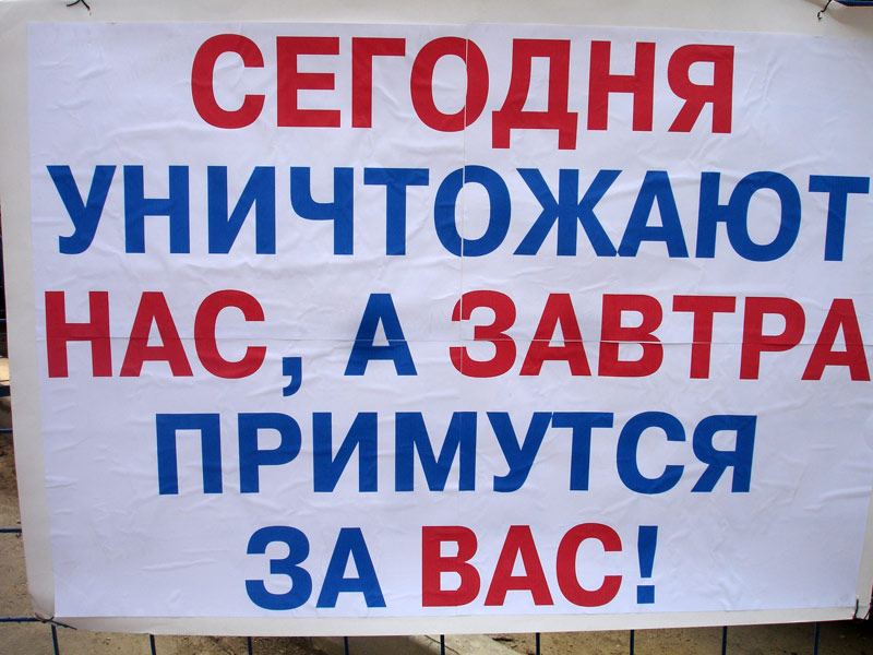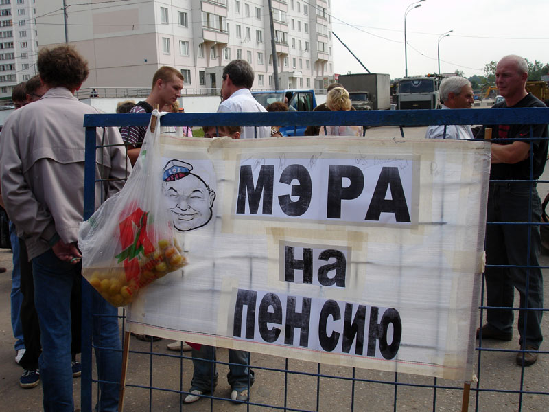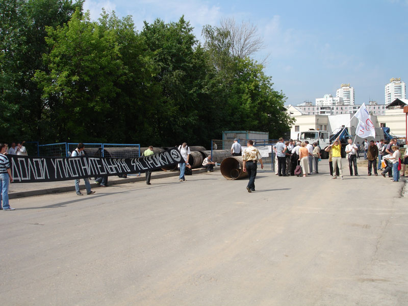 Одновременно акция протеста проходила около дома 47 по улице Изюмской. Там собралось около 50 человек. Нацболы и активисты ОГФ соорудили импровизированные баррикады на выезде с территории штаба строительства. Были выставлены заграждения с плакатами "Мэра на пенсию", "Сегодня уничтожают нас, а завтра примутся за вас", "Люди, остановитесь, мы просим вас о помощи", "Жулебино, Бутово... есчо одни жлобы?" - с комическими изображениями мэра Москвы Юрия Лужкова. Вдоль дороги нацболы развернули растяжку "Нет уплотнительной застройке!".