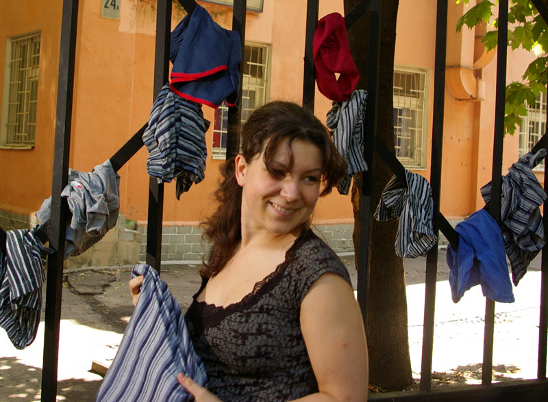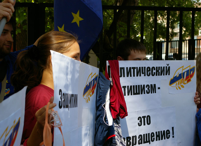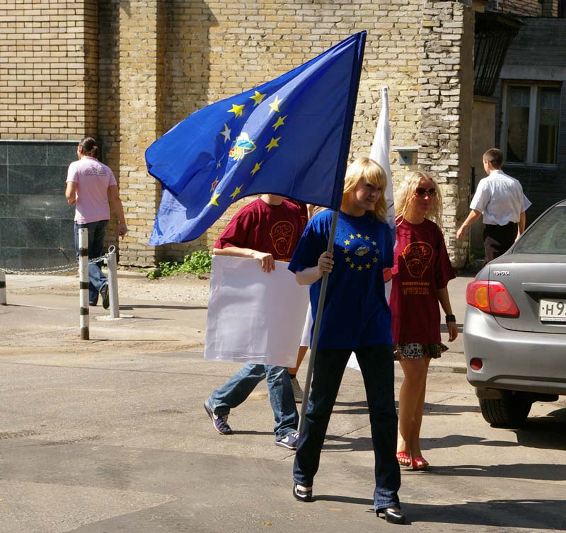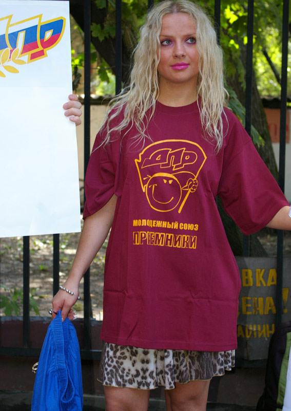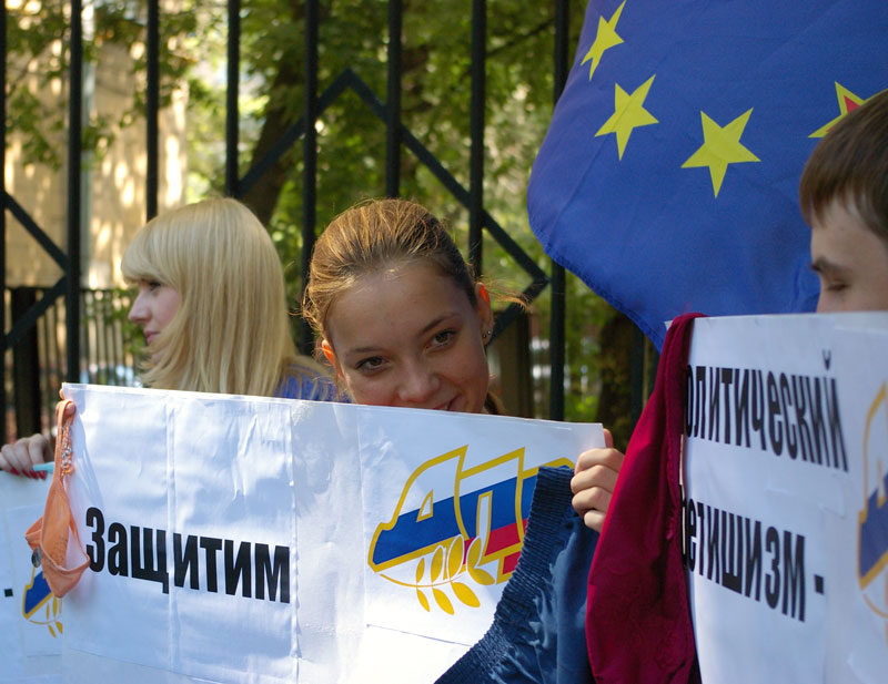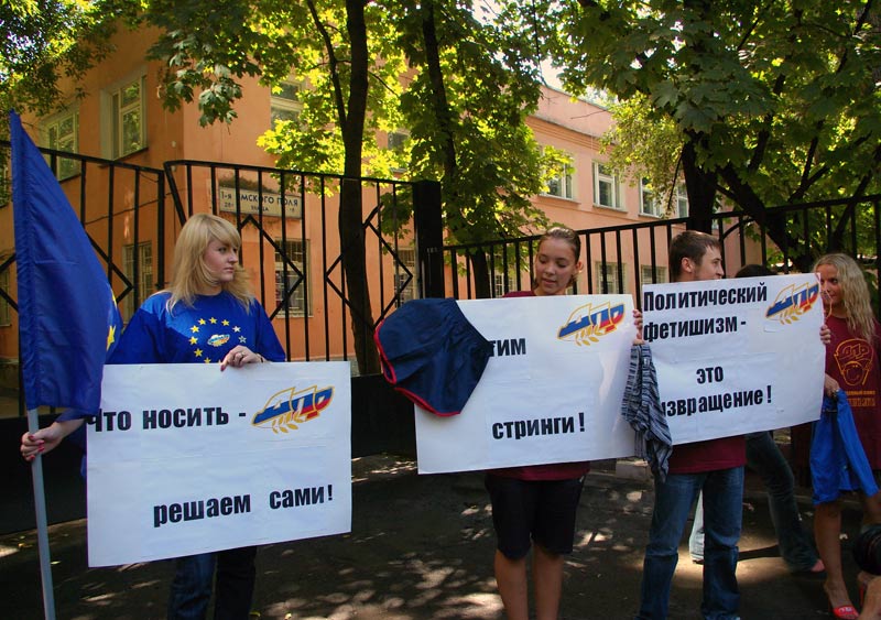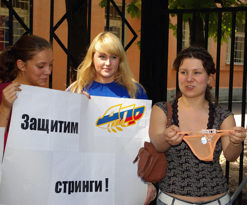 "Защитим стринги!", "Что носить - решаем сами!" - такие плакаты держали молодые девушки и парни. Скандировались аналогичные лозунги, а также программный - "Россия, ДПР, Евросоюз!" Пикет был разрешен лишь на 5 человек и продлился полчаса, после чего оперуполномоченный милиционер потребовал его свернуть. В ответ активисты развесили на воротах штаба "Наших" семейные трусы и разноцветные трусики стринги. Как пояснила Екатерина Винокурова, данная продукция является собственностью ДПР.