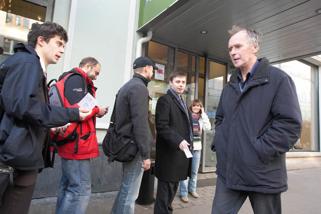 Около 15 человек, среди которых были активисты движения "Мы", "Обороны", "Трудовой России" и "Свободные радикалы", выстроились в очередь у входа в супермаркет. Участники мероприятия раздавали талоны на продукты всем желающим и предлагали присоединиться к очереди, ставили номерки на руках. В магазине активисты покупали сахар и чай. На кассе молодые люди попытались расплатиться за продукты талончиками, однако им пришлось оплатить покупку деньгами.