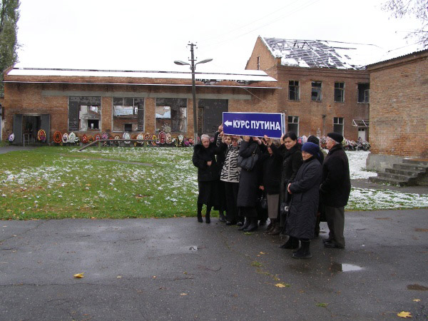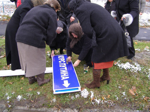 По ее словам, участники акции установили у дороги рядом с школой плакат-указатель, на котором написано "Курс Путина" и стрелочка, указывающая на школу. Сотрудники милиции присутствовали на акции, однако не предпринимали попыток убрать плакат.