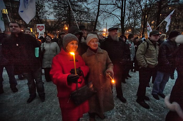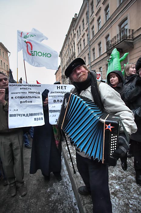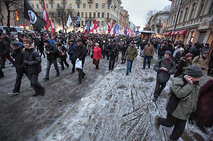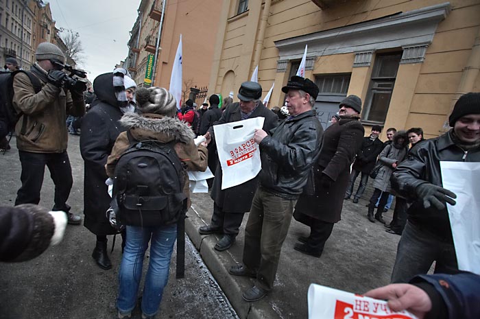 В петербургском "Марше несогласных" приняли участие более 2 с половинйо тысяч человек. Главные лозунги: "Нам нужна другая Россия!", "Это наш город!", "Путин, лыжи, Магадан!", "Нет полицейскому государству!". Активисты "Обороны" развернули растяжку "1968-2008. За нашу и вашу свободу". Активисты "Другой России" из Москвы раздали более 200 пакетов с надписью "В фарсе не участвую!", использовавшихся на флэш-мобе в Москве 2 марта. Манифестанты свистели в сотни свистков, что символизировало освистывание власти.