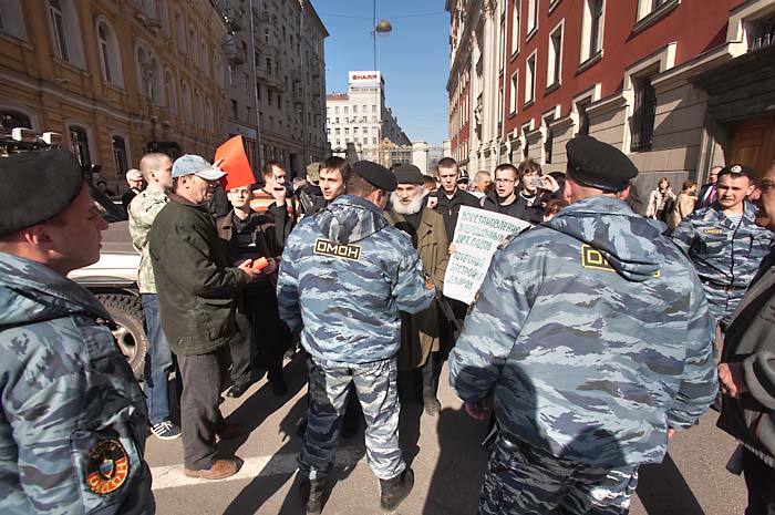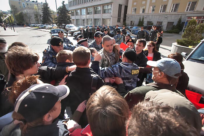 Группе, направлявшейся в сторону приемной мэрии преградил путь ОМОН. Граждане пытались сопротивляться задержанию, сцепившись кольцом. В адрес ОМОНа скандировали "Бандиты!" и "Милиция с народом! Не служи уродам!". Однако все участники были задержаны.