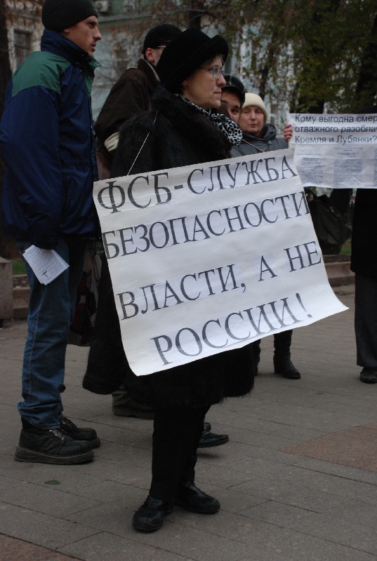 В пикете, организатором которого выступил "Антивоенный клуб", приняли участие около 30 человек. Они держали портрет Литивненко и зажигали свечи. Также пикетчики держали плакаты "Власть скрывает правду", "Кому выгодна смерть отважного разоблачителя Кремля и Лубянки?" и "ФСБ нарушает закон".