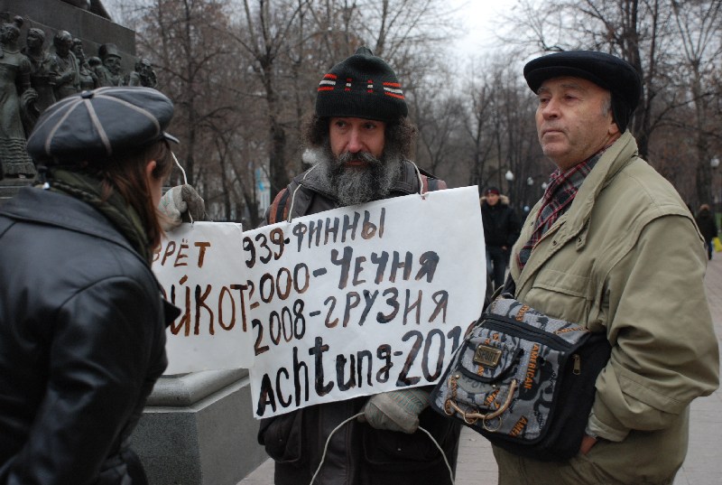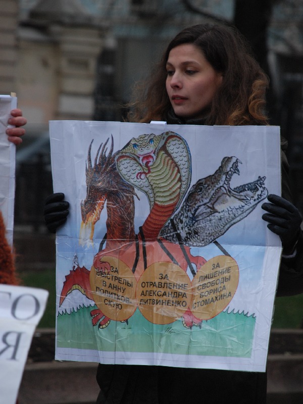 На одном из плакатов была изображена гидра с головами дракона, змеи и крокодила. Нам каждой из голов - медаль: "За выстрелы в Анну Политковскую", "За лишение свободы Бориса Стомахина" и "За отравление Александра Литвиненко". Кроме того, еще на одном плакате было написано "Закон №35-ФЗ от 6 марта 2006 года позволяет убивать любого человека в России и за ее пределами. Достаточно назвать его террористом".