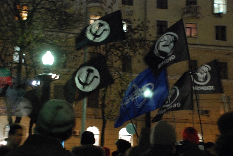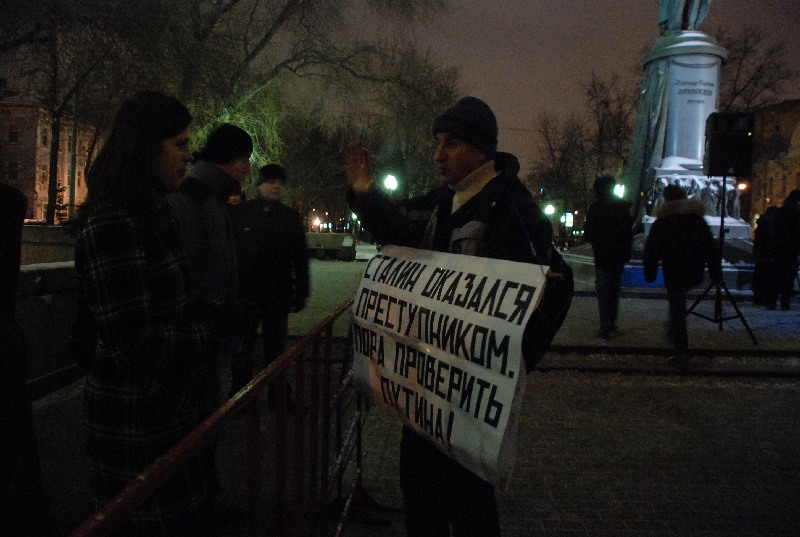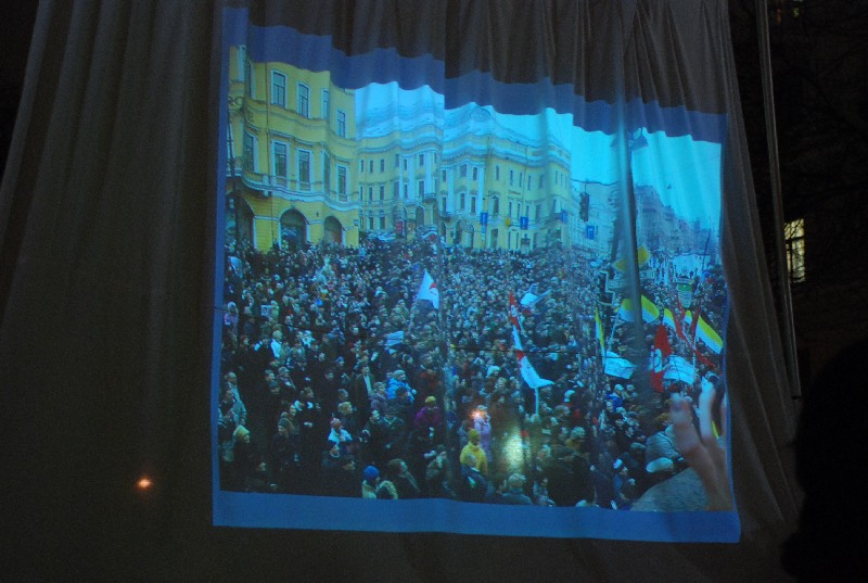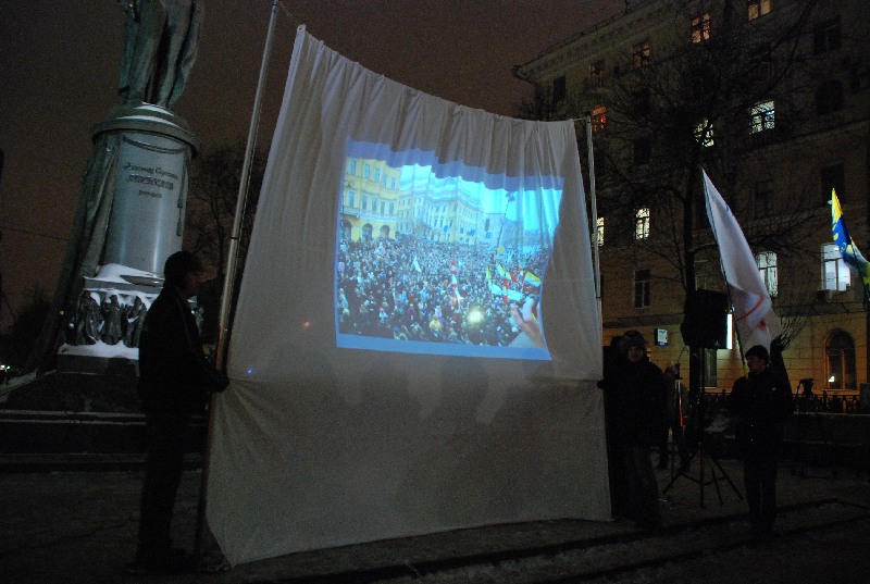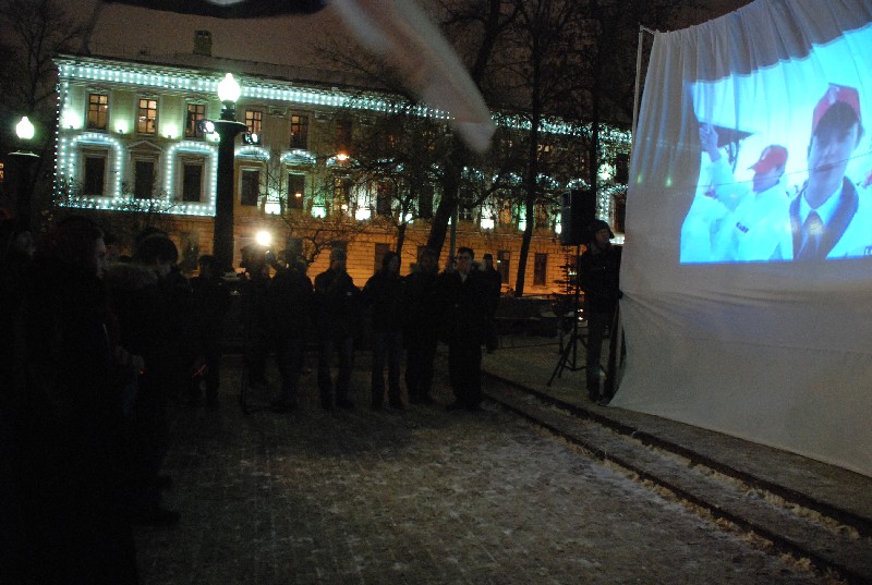 Далее были показаны ролики с "Марша несогласных", который прошел в Москве 14 декабря. Чернозуб рассказал собравшимся про то, как на "Марше" были избиты пожилые генералы, про зверства ОМОНа на Триумфальной площади, а также про то, что нескольким сотням участников все же удалось пройти с флагами и транспарантами по Садовому кольцу.