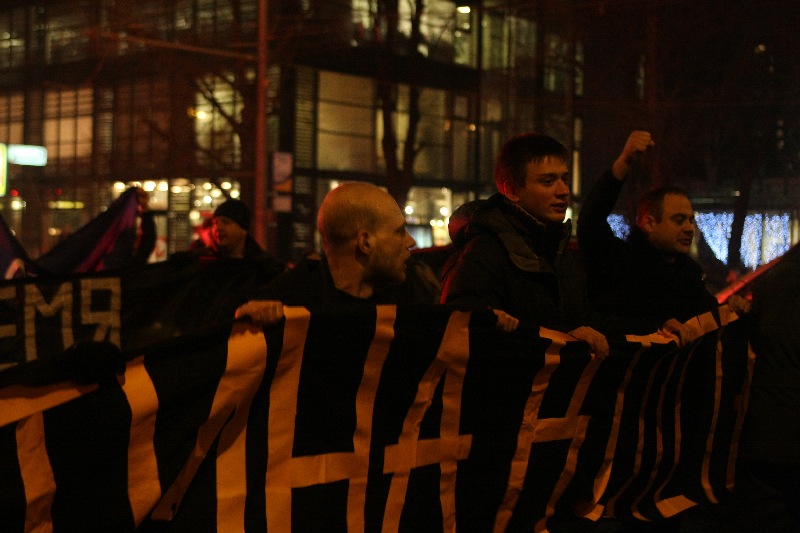 Всех тех, кого оперативники пытались задержать уже на улице, "несогласные" быстро отбили, затем пошли маршем сначала по тротуару, а потом и по проезжей части, впереди, к слову сказать, небольшого потока машин, движущихся в направлении центра. К тем, кто приехал с "Тверской", присоединились и нацболы, собиравшиеся на другой станции.