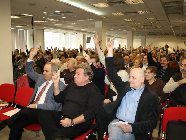 На конференции московского отделения движения "Солидарность" 15 марта было принято решение не вводить пост председателя движения, а оставить коллективное руководство. Против введения поста председателя проголосовали 169 делегатов, за — 141 делегат, 17 воздержались. Об этом с места событий передает корреспондент Каспаров.Ru.