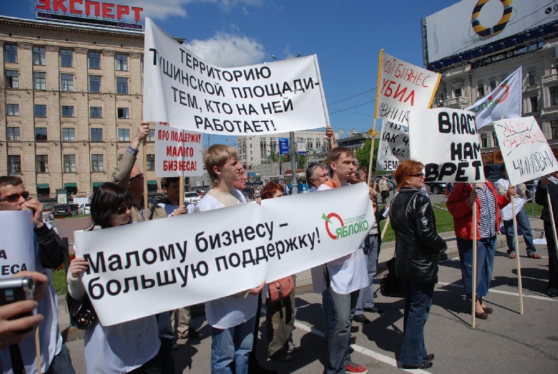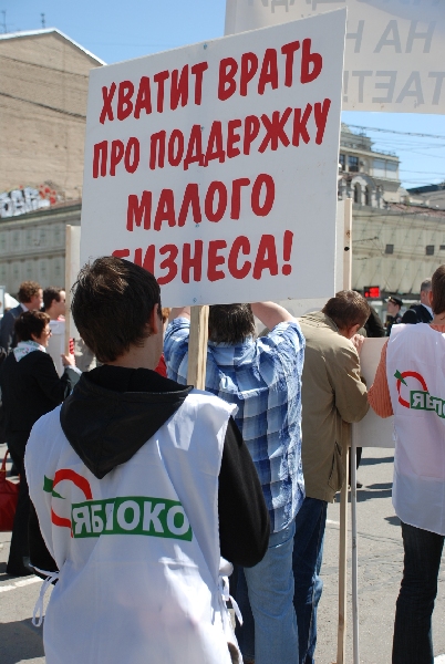 В день предпринимателя 26 мая партия "Яблоко" провела в Москве митинг "Малому бизнесу — большую поддержку". Об этом сообщил корреспондент Каспаров.Ru с места событий.