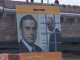 На баннере размещен призыв "Пора меняться". С одной стороны полотна изображен Михаил Ходорковский, с другой — премьер-министр России Владимир Путин за решеткой.