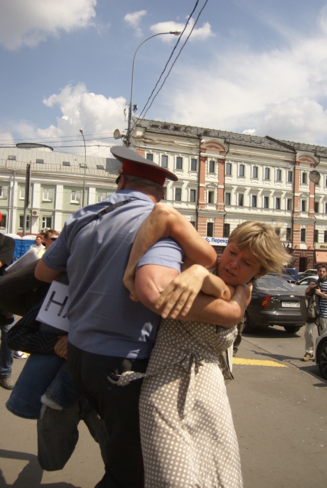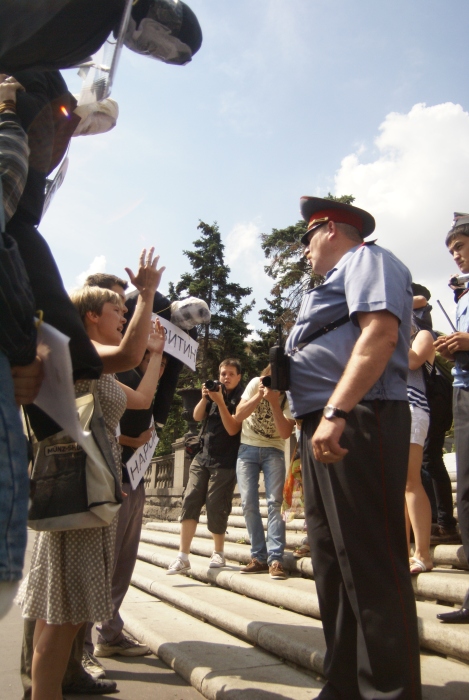 Чирикова попыталась объяснить собравшимся, в том числе сотрудникам полиции, ситуацию вокруг строительства трассы Москва — Санкт-Петербург через Химкинский лес.