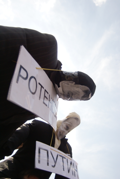 Активисты вышли к памятнику с тряпичными куклами, изображающими премьера Владимира Путина, бизнесмена Аркадия Ротенберга и министра транспорта Игоря Левитина. На активистах были таблички с надписью "народ", а куклы сидели у них на плечах.