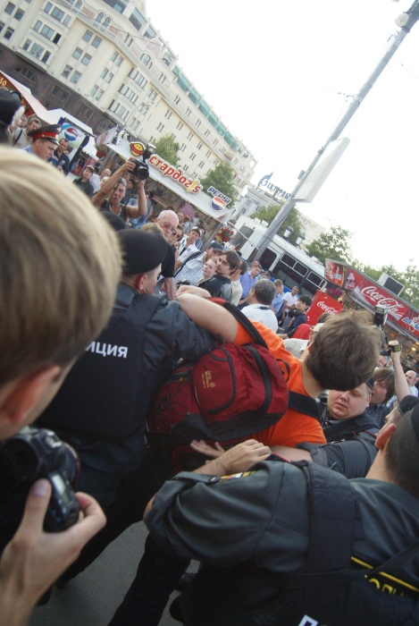 Задержанных отвезли в ОВД "Тверское". По словам очевидцев, в отделении двоих оппозиционеров жестоко избили.