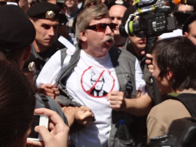 Были задержаны несколько человек в масках. Также в автозак отправился активист с плакатом "Объединяйтесь. Facebook".