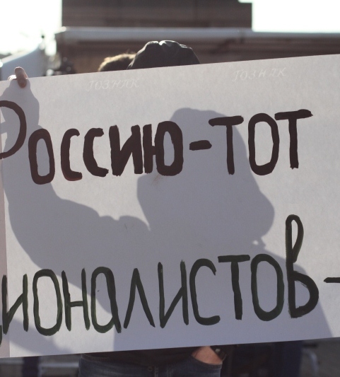 Там же националисты развернули свой транспарант с надписью "КС без националистов — игрушка в руках врага". Какого именно врага они имеют в виду, молодые люди объяснить не смогли.