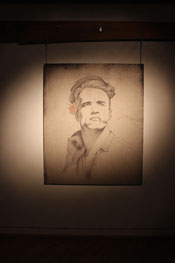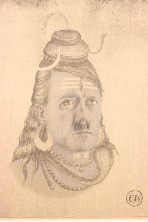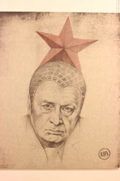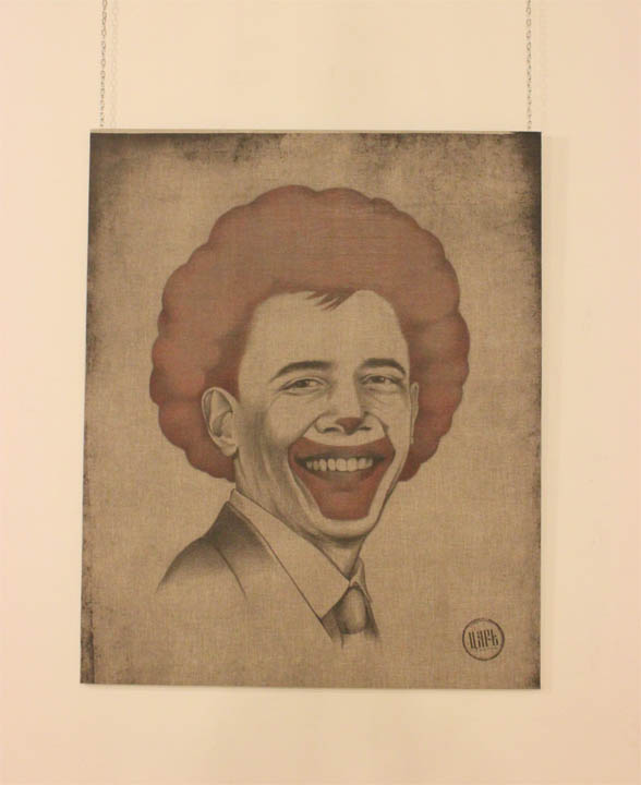 На выставке были представлены двадцать работ, выполненных в технике графики. На картинах изображены известные личности, начиная от Папы Римского в образе Джокера и заканчивая Муаммаром Каддафи в образе капитана Джека Воробья.