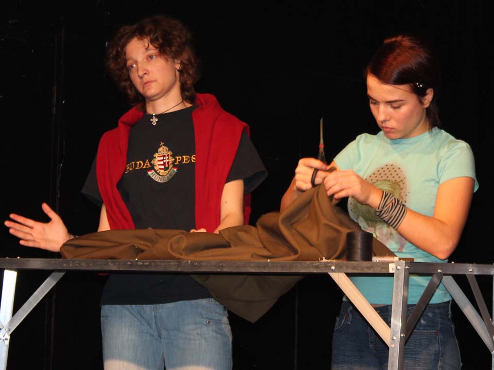 Свет гаснет, звукорежиссеры возвращаются из курилки, начинается спектакль. На сцену выносят символические железные "нары", на них сидят три женщины. Кроме этих нар, декораций больше не будет. Действие происходит в женской колонии общего режима, жизнь девушек расписана по часам. Подъем, зарядка, уборка, шитье формы для полицейских.