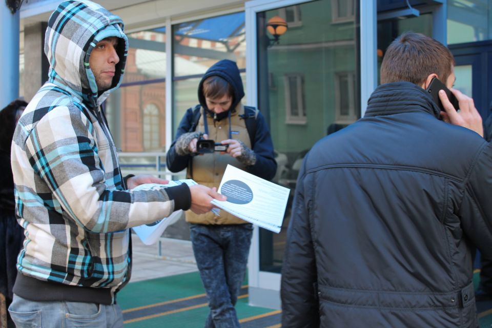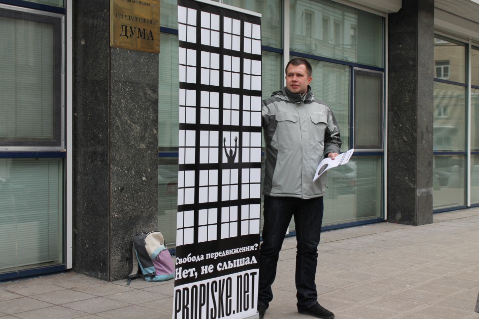 Около десятка человек собрались во дворе Думы. Они поставили плакат "Свобода передвижения? Нет, не слышал" и начали раздавать листовки. В них перечисляются меры ответственности за нарушение закона, а также говорится о том, что положения закона нарушают статью 27 Конституции: "Каждый, кто законно находится на территории Российской Федерации, имеет право свободно передвигаться, выбирать место пребывания и жительства". Активисты призывают граждан противодействовать закону - обращаться к президенту и правительству, распространять информацию о неконституционном законе в СМИ, а также информировать о нем знакомых.