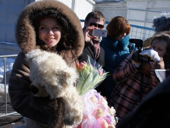 Уже очень смущенная Женя и мама Ковязина благодарили за подарки и старались убраться из-под вспышек фотокамер.