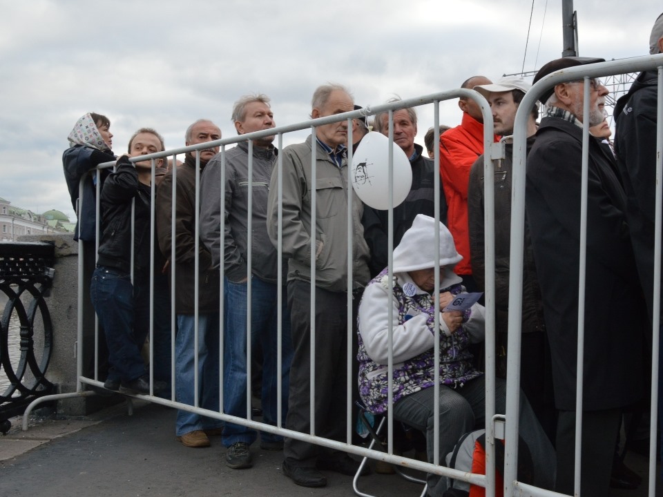К началу митинга собралось более семи тысяч человек. Участники акции пришли с плакатами: "Пока кто-то в оковах, никто не свободен", "Дело против Навального — дело против меня", "Когда право становится бесправием, протест становится долгом", "Вам не понравились наши шарики… Возьмем вилы" и другими. Рядом со сценой в ряд выстроились люди в белых майках с надписью: "Свободу "узникам 6 мая".