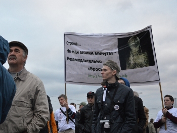 Но эту просьбу проигнорировали националисты, их трехцветные флаги продолжали развиваться в небе. Позже свою атрибутику подняли "яблочники", активисты из ЛГБТ-движения, РСД и анархисты. Активисты из движения "Партизанинг" вдали над толпой подняли собственный политический "атрибут" — надувную блестящую конструкцию, похожую на фаллос.