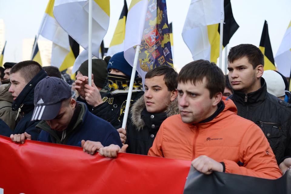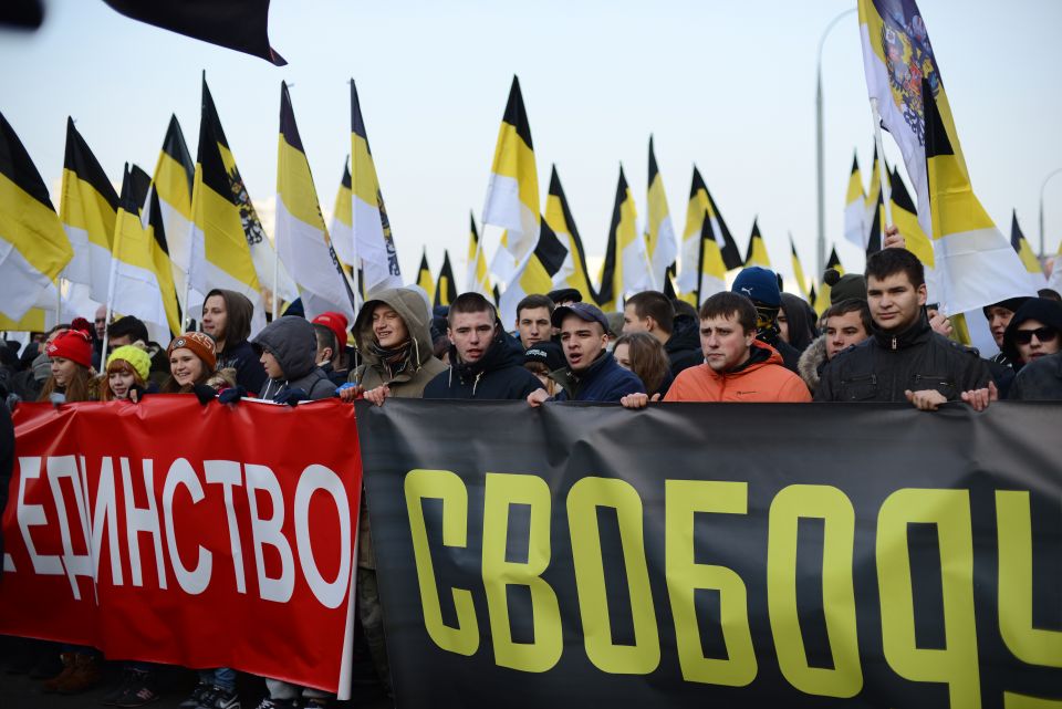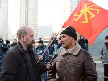 Перед шествием в самом начале колонн развернули огромное имперское полотнище. Сейчас колонны должны двинуться. Но происходит какая-то заминка. Лидер объединения "Русские" Дмитрий Демушкин с грустью сообщает журналистам, что в этот раз на акцию пришло значительно меньше людей (чуть больше 2 тысяч) и поясняет, что это произошло из-за украинской темы. Потом он рассказывает, что последние две недели на организаторов "Русского марша" власти оказывали давление и ему пришлось выйти из их рядов. Кроме этого, столичные власти отказали в проведении митинга и концерта после окончания марша.