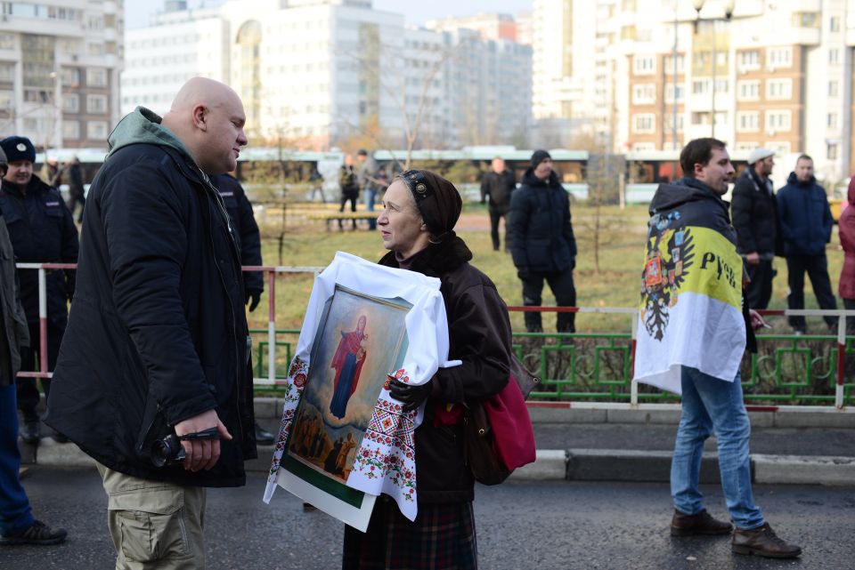 Тем временем от станции метро Октябрьское поле до Щукинской проходил "Русский марш за Новороссию". К участию в акции призывал бывший полевой командир Игорь Стрелков (Гиркин). В самый последний момент он отказался выходить на шествие, сославшись на расхождения в отношении к российской власти с формальным организатором мероприятия. На эту акцию, по оценке столичной полиции, пришло 1,5 тысячи человек.