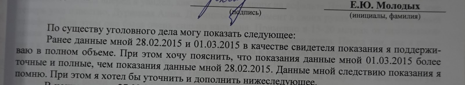 А я будучи знакомым с материалами дела, знаю о каких причинах может идти речь. И где, услышав эту новость от Алексея Алексеевича, я честно говоря слегка ошалел, когда представил как этот хлопчик сможет появиться в суде и это при том не какой имидж у него в интернете, а какие он показания дал ранее на следствии. А забегая вперед, скажу, что "чистильщик" Евгений Молодых, давал показания трижды. Первый раз в ночь сразу же после убийства 28 февраля и там он такого наговорил,такооооого, что после этого потребовалось аж две корректировки: сначала 1 марта, а затем еще 15 апреля и где отдельно пришлось сделать оговорку, что хоть от первых показаний он и не отказывается, но они были "не точными и не полными"!