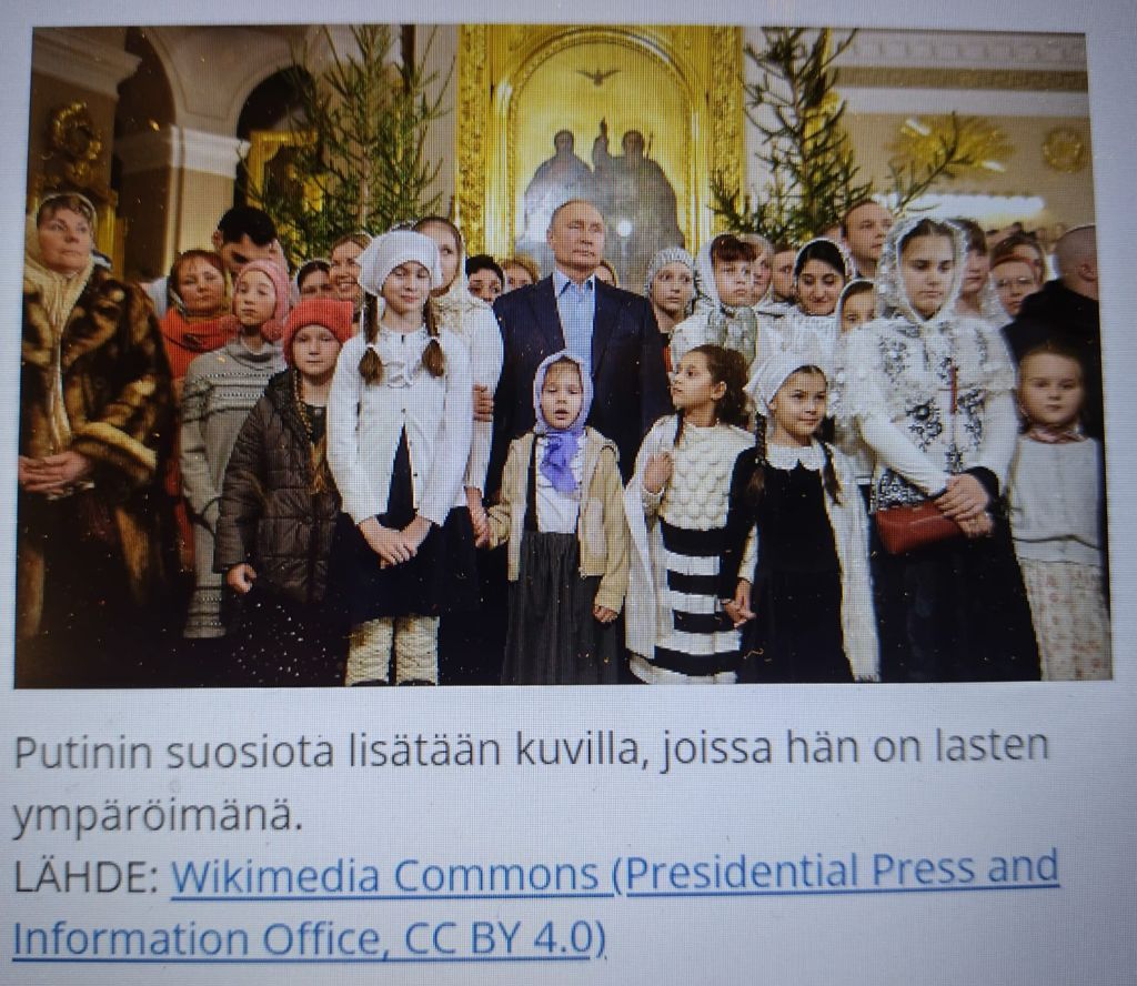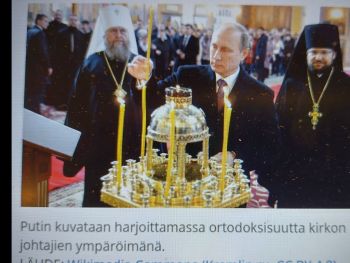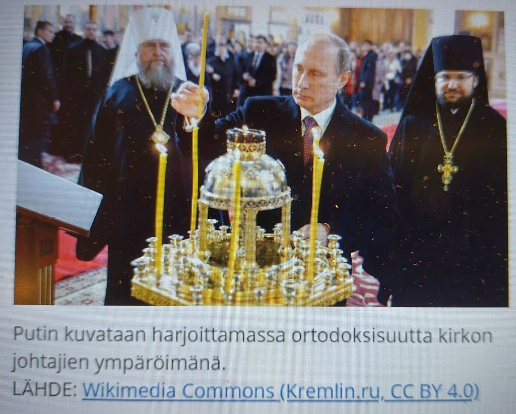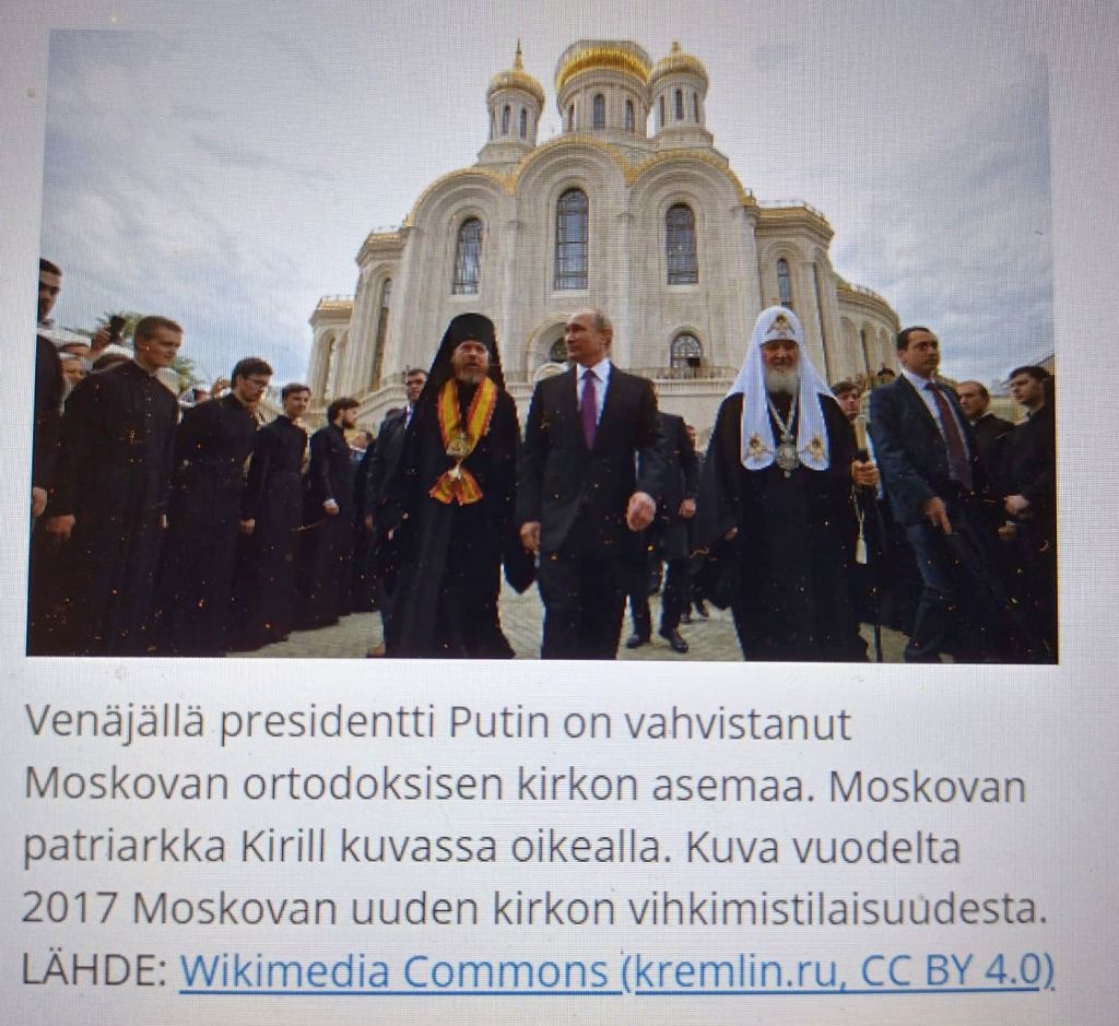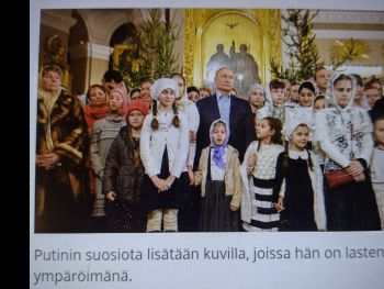 В Финляндии у меня родился внук, который уже давно окончил школу. Я видел его учебники. Поражает учебник по религии, где написано, что даже самые уважаемые люди планеты верят в бога и молятся. Фотографию из учебника с Путиным и Медведевым я приложу. Внук изучал русский язык по учебнику, написанному тоже "странными" людьми, где тоже достаточно подобных моментов.